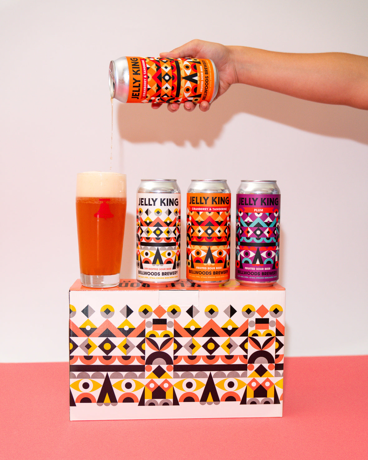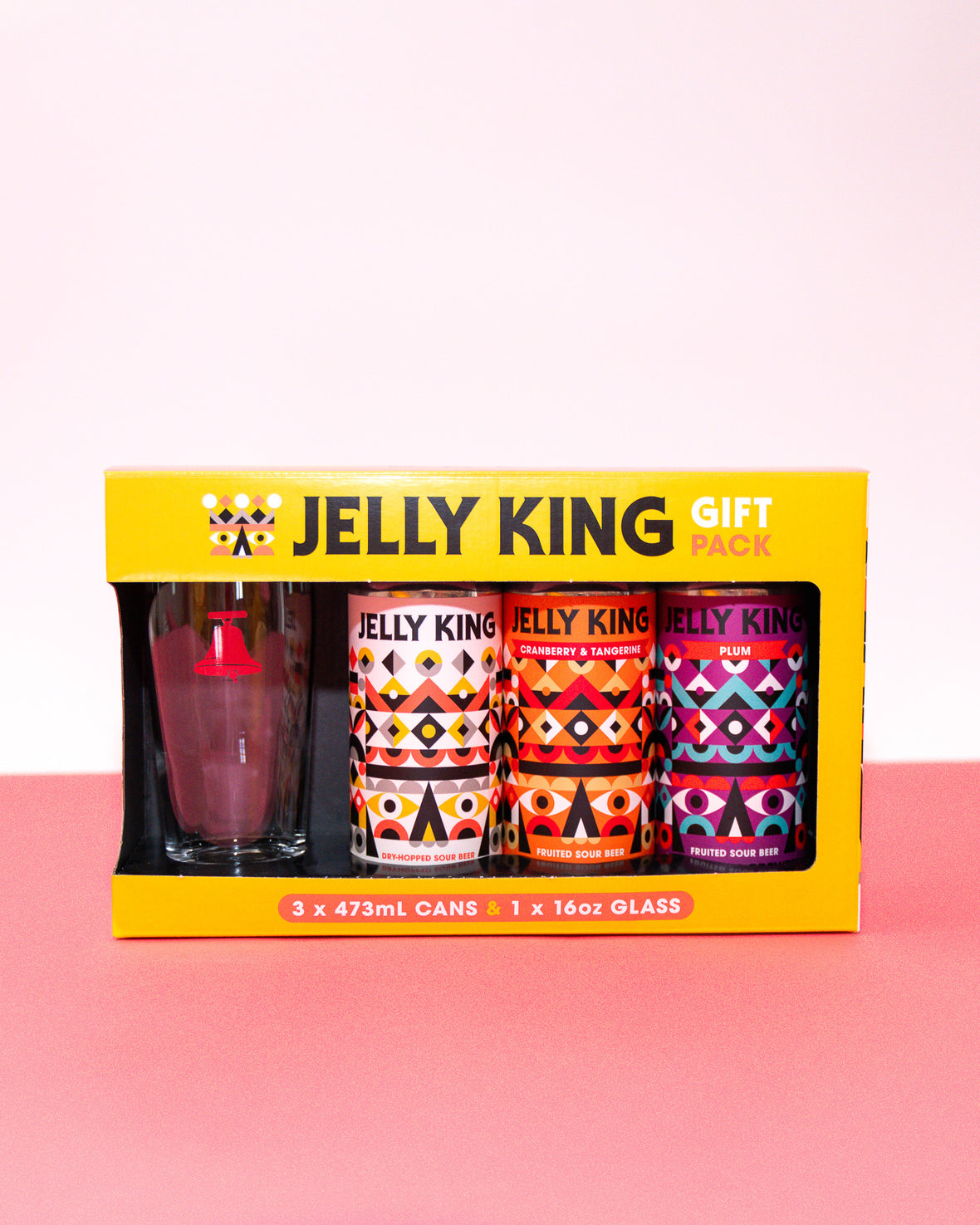 Inside each beautifully decorated box is one can of each original Jelly King, one Jelly King Cranberry Tangerine and one Jelly King Plum, as well as a Bellwoods branded glass to enjoy said beers in.