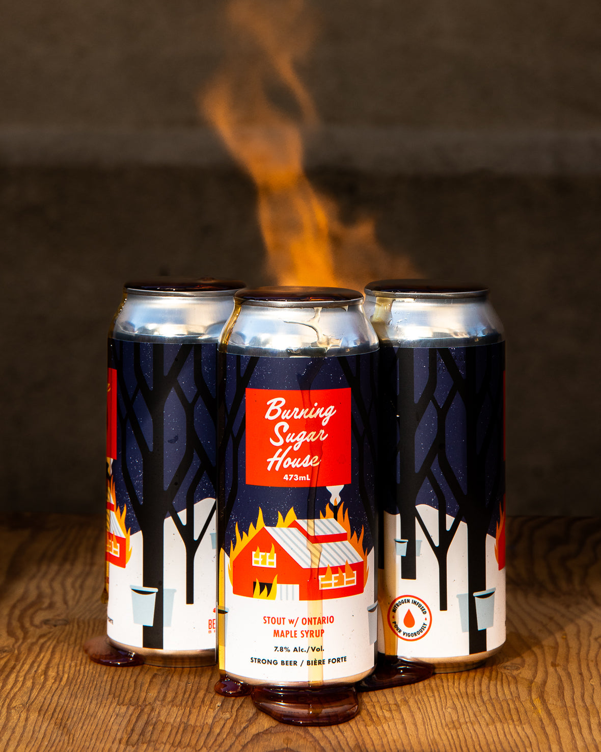 This beer has had a few iterations over the years, starting as an IPA called Sugar House in 2017, and then a DIPA called Sugar Sugar House House in 2024. To take it up a notch, we decided to set fire to our idea of what this beer could be, and go all in on the Canadiana theme with Burning Sugar House.