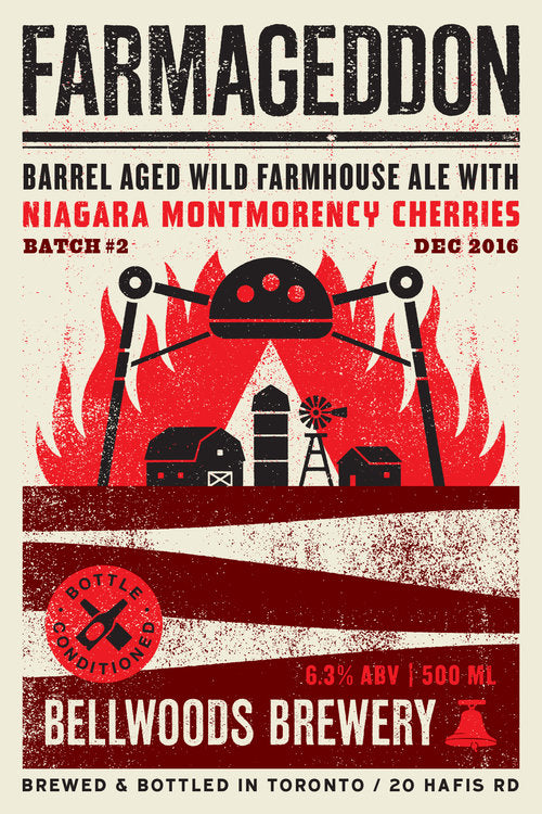 What it smells and tastes like: Fragrant Montmorency cherries beautifully wrapped up in a light, oaky and subtly tart wild farmhouse ale. Floral/spicy notes, with that characteristic brett funk we know and love in Farmageddon. Finishes dry.