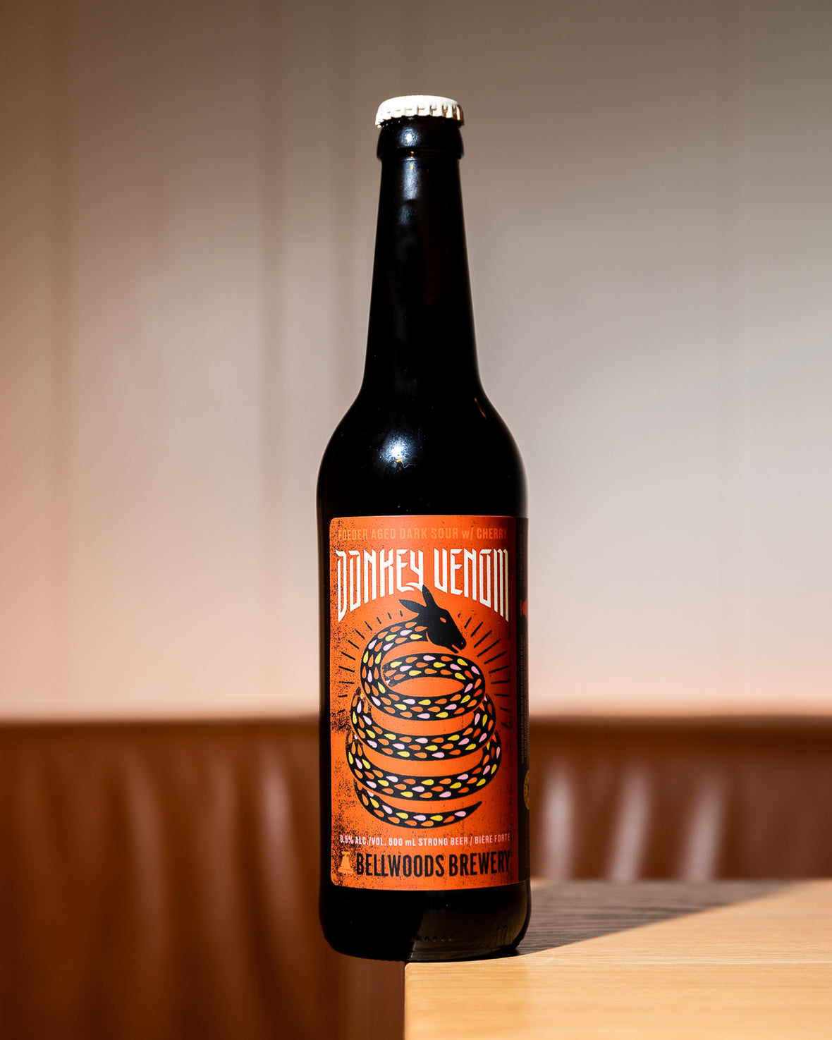 One of the first aged sours to leave oak at Bellwoods, Donkey Venom is a complex beer that we release a couple times each year. At its roots it's a rich, dark ale, but the time it spends in barrels with brett and bacteria harmonizes the ingredients, yielding bright levels of acidity and complimentary fruit flavours. A hybrid style of sorts, that defies simple categorization.