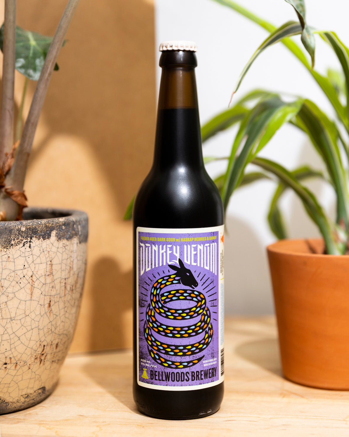 One of the first aged sours to leave oak at Bellwoods, Donkey Venom is a complex beer that we release a couple times each year. At its roots it's a rich, dark ale, but the time it spends in barrels with brett and bacteria harmonizes the ingredients, yielding bright levels of acidity and complimentary fruit flavours. A hybrid style of sorts, that defies simple categorization.