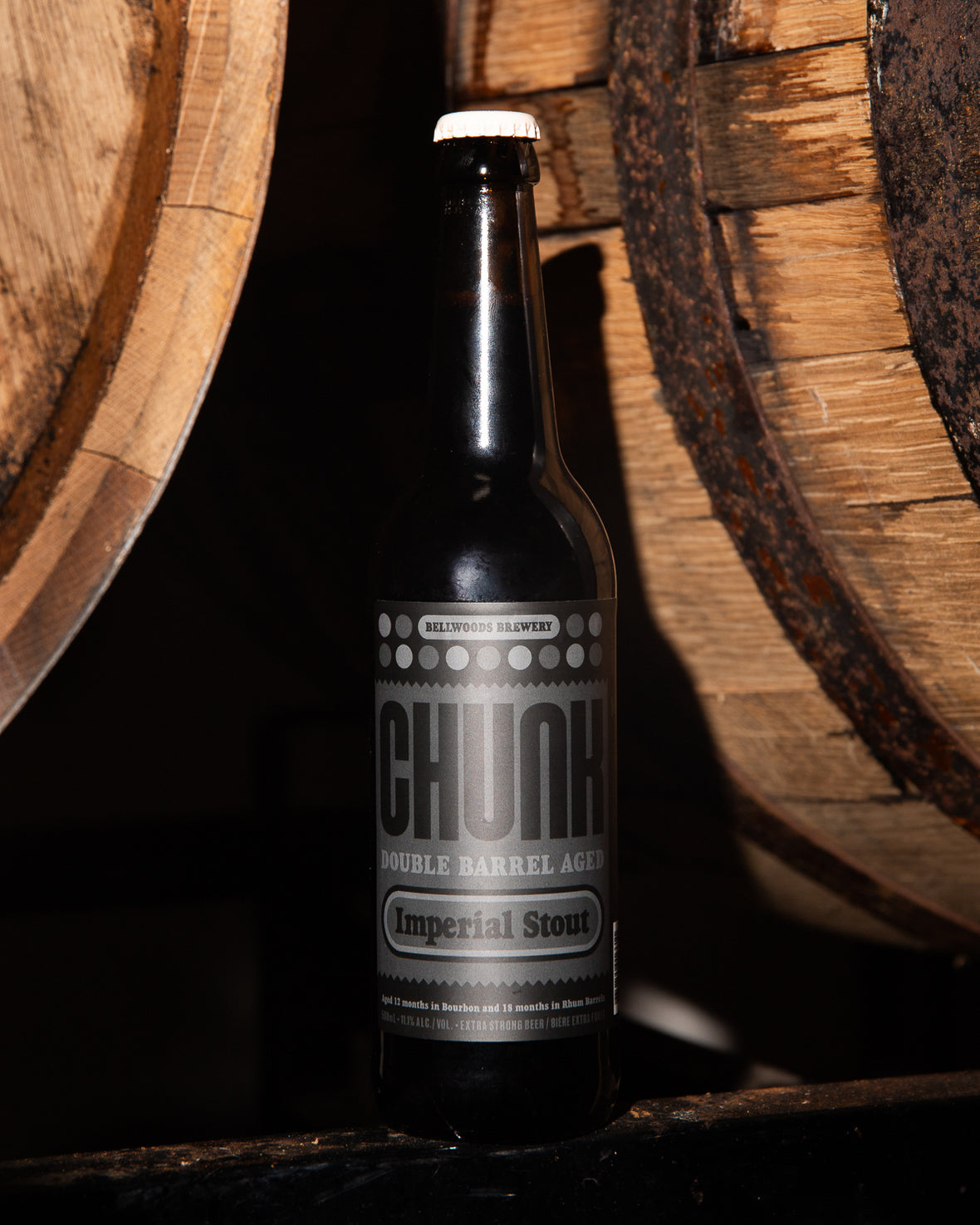Double Barrel Aged CHUNK spent 12 months maturing in bourbon barrels before making its way into rhum barrels in April of 2023. That’s a full 30 months of bubbling and aging, resulting in a beer that is, quite simply, over the top.