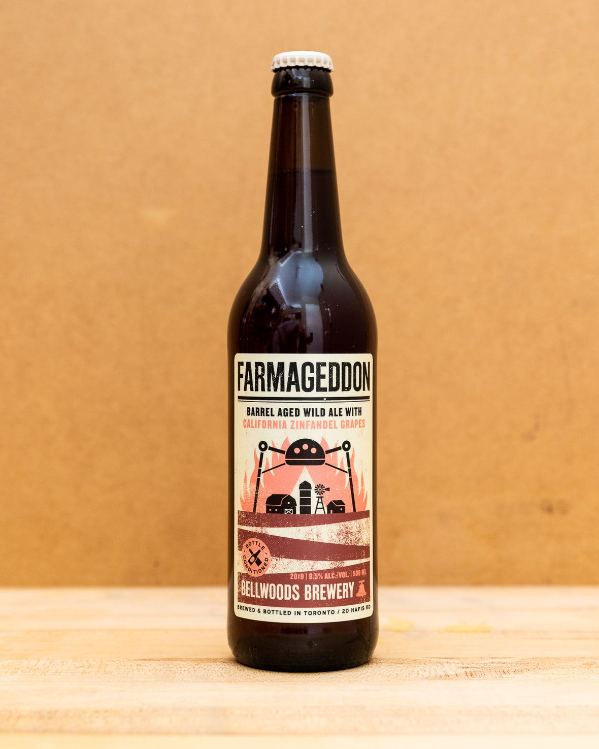 Acting as counterpart to Farmageddon with California Zinfandel Grapes, and following afterwards, this version was created by blending a batch of Farmageddon, and then conditioning it briefly on Zinfandel grape lees in a style similar to that of White Zinfandel. The minimal skin contact results in a beer with a characteristic rose hue.