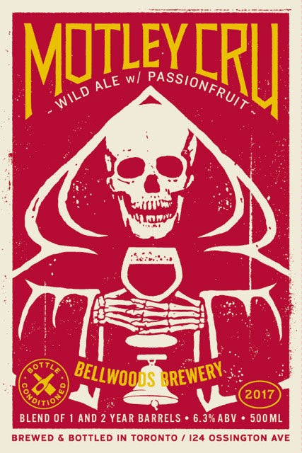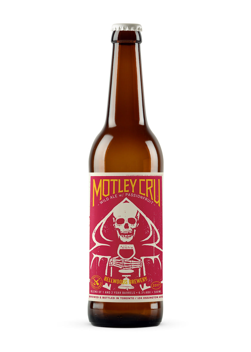Motley Cru is our anniversary release, with the only requirement being that the final beer must incorporate a blend of various barrels. This year's edition is a wild ale with passion fruit blended from two mixed grain ales (containing pale ale barley malt, wheat, oats, and rye). Both new American oak barrels, and old use (wild ale program) barrels from Niagara and Prince Edward County provide an eclectic range of wild and local yeast strains, and several hundred kilos of passion fruit puree create a fantastic balance of old world sour flavours and bright tropical notes. Extra time spent conditioning in the bottle provides a lively carbonation.