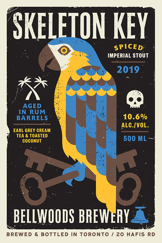 Normally released annually, Skeleton Key is our rum barrel aged imperial stout, spiced with a mélange of ginger, all spice, black pepper, cardamom, cinnamon, star anise, nutmeg and juniper berries. This extremely limited variant is comprised of two of our favourite barrels blended together and then conditioned on Earl Grey Cream tea from Pluck Teas and toasted coconut.